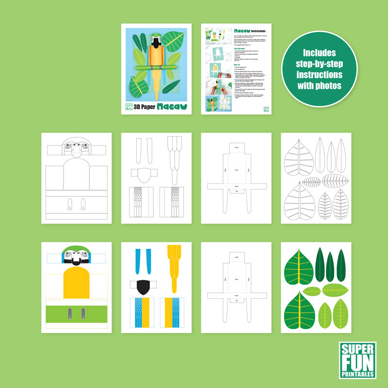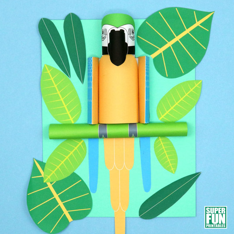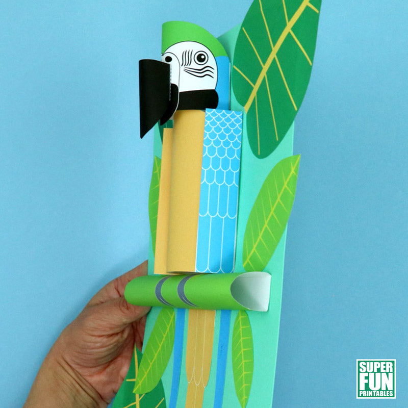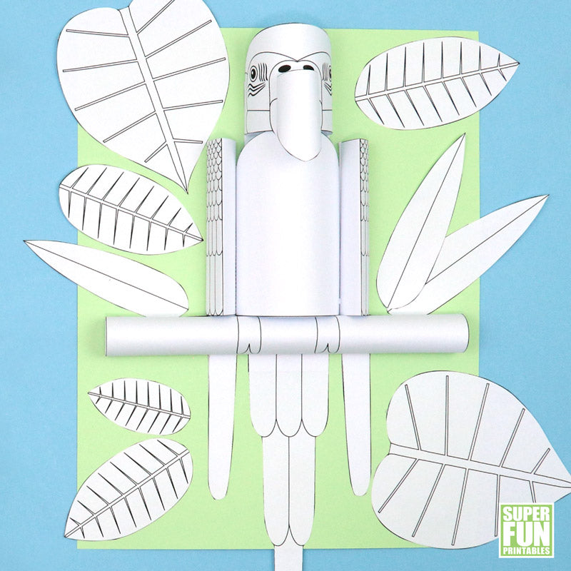 Create a colourful 3D macaw in a vibrant jungle setting with this printable template.