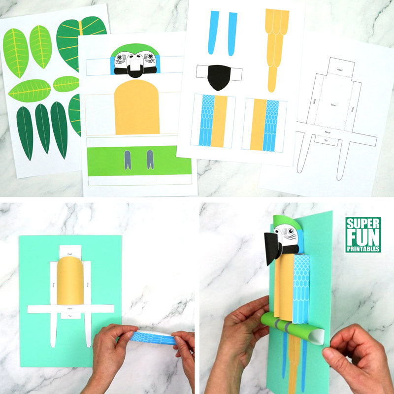 The craft consists of basic cutting, gluing and folding and is a great activity to help build fine motor skills and support learning about jungle animals from the Amazon.