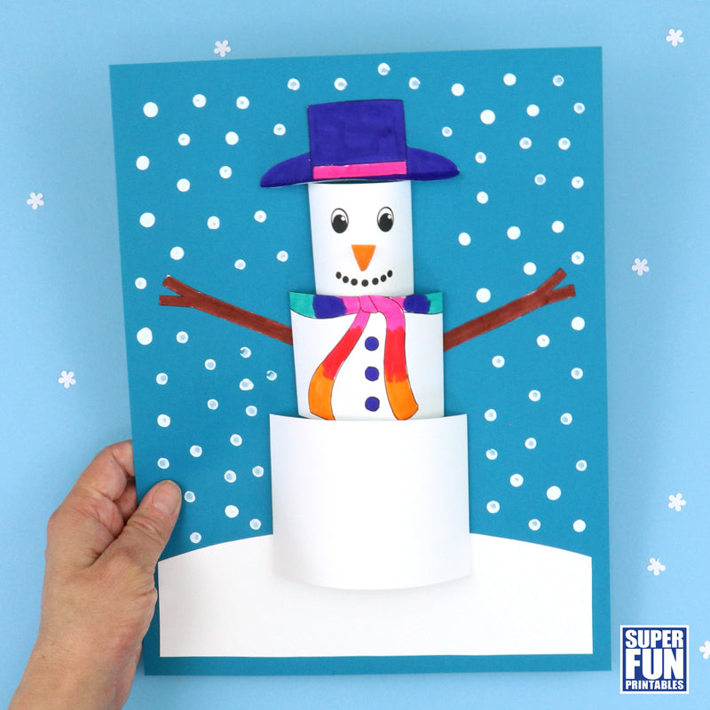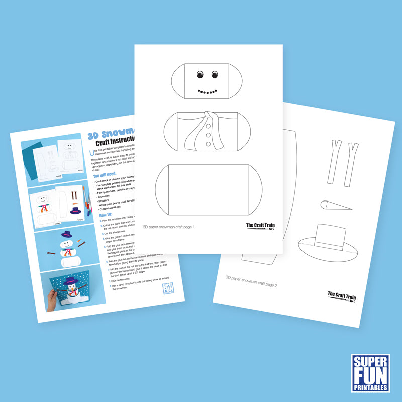 Use this printable template to create a 3D paper snowman craft surrounded by falling snow. The paper shapes making up the snowman are glued on with a raised curve, giving the scene a 3D effect.