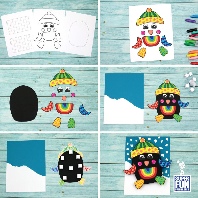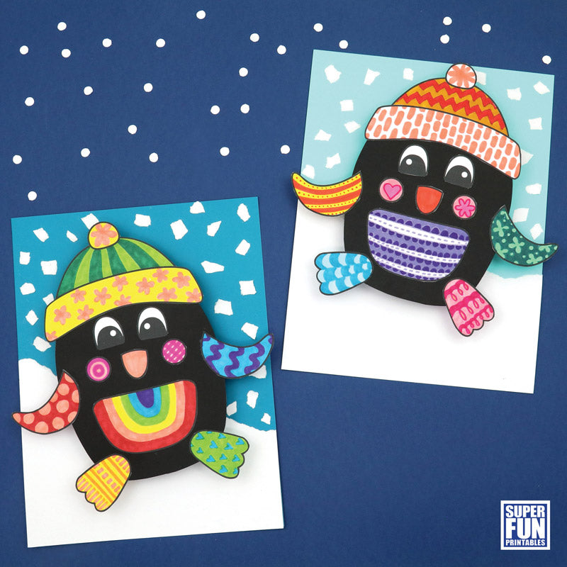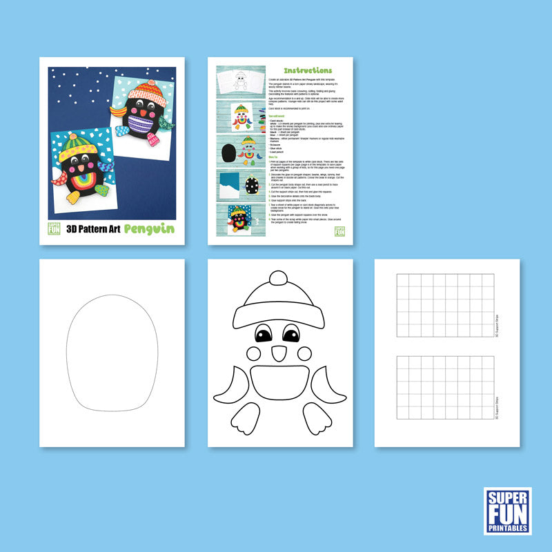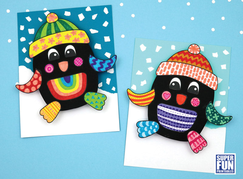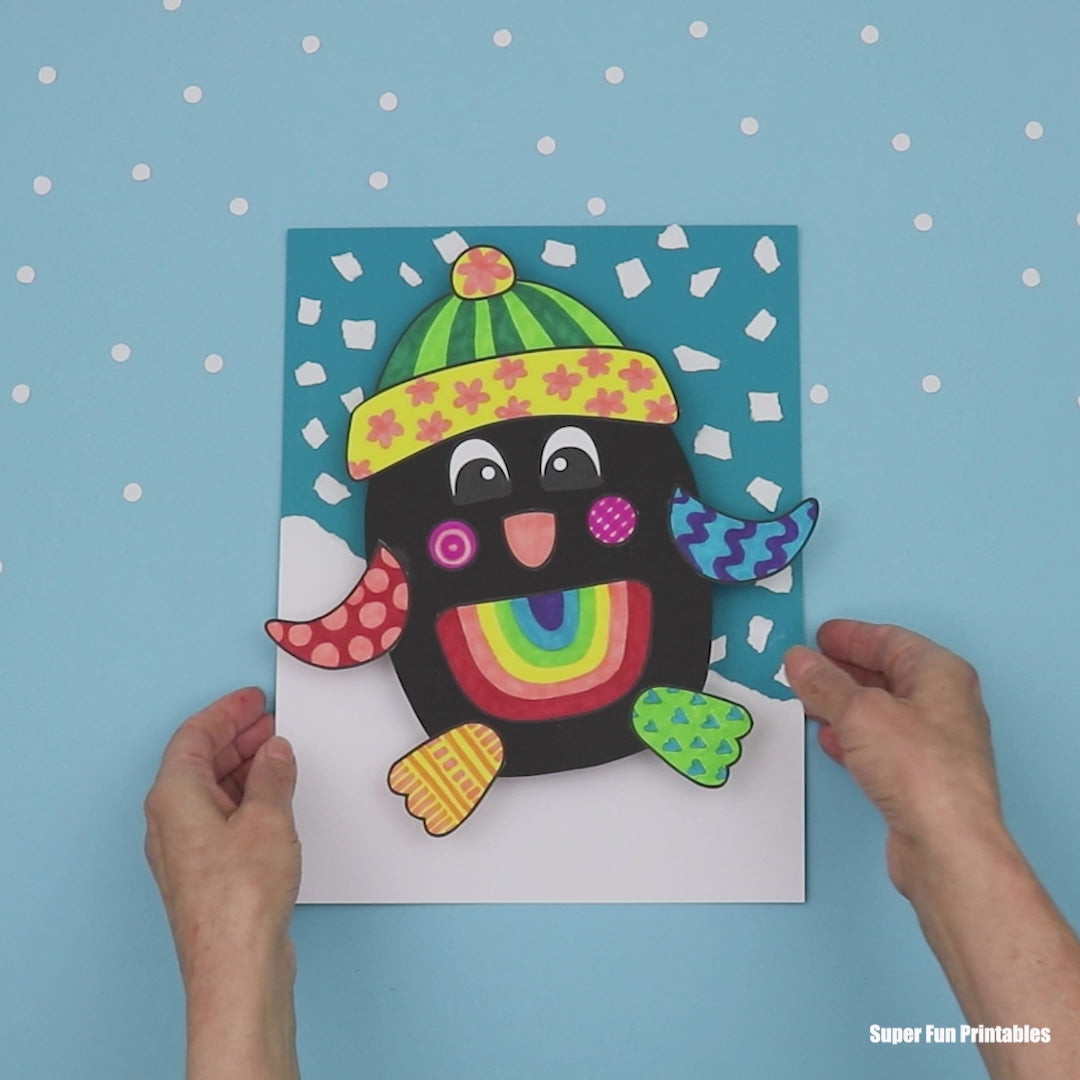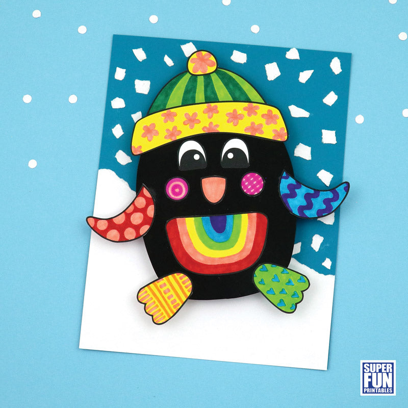 Make a colourful 3D Pattern Art Penguin that really 'pops'. This is a fun Winter-themed kids' craft project involving basic patterning, cutting, folding and gluing.