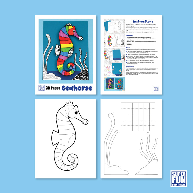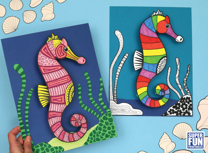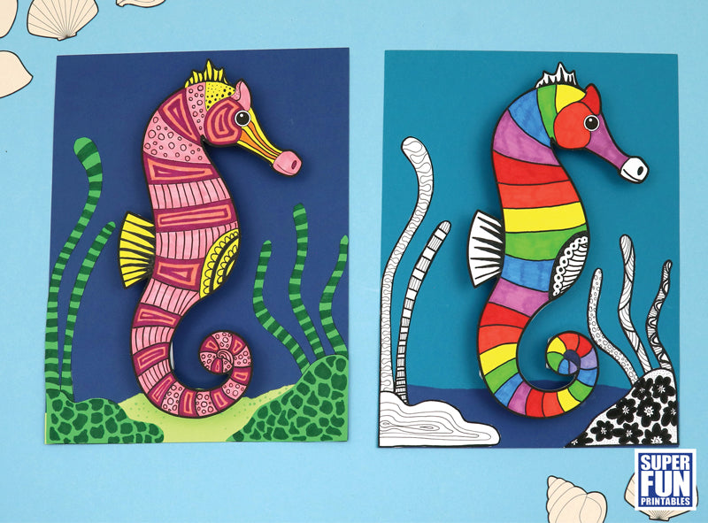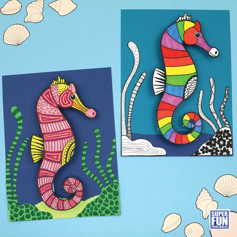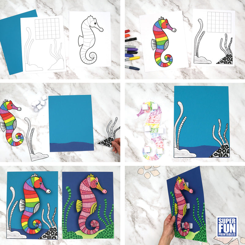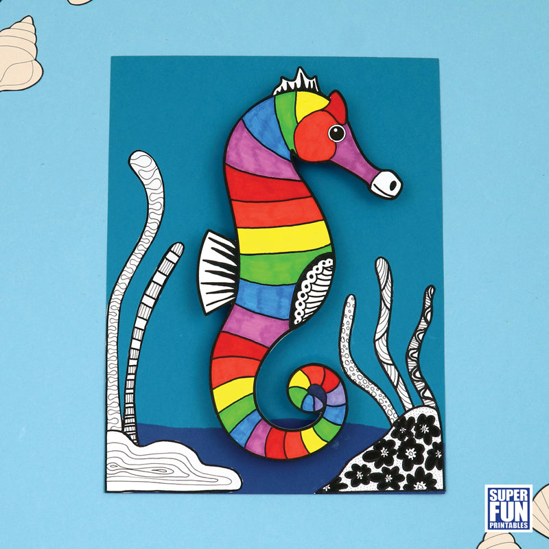 Use this template to make 3D paper Seahorse. The finished project features a seahorse that pops off the page with the help of 3D paper supports. He drifts over an ocean background amongst patterned seaweed and rocks.