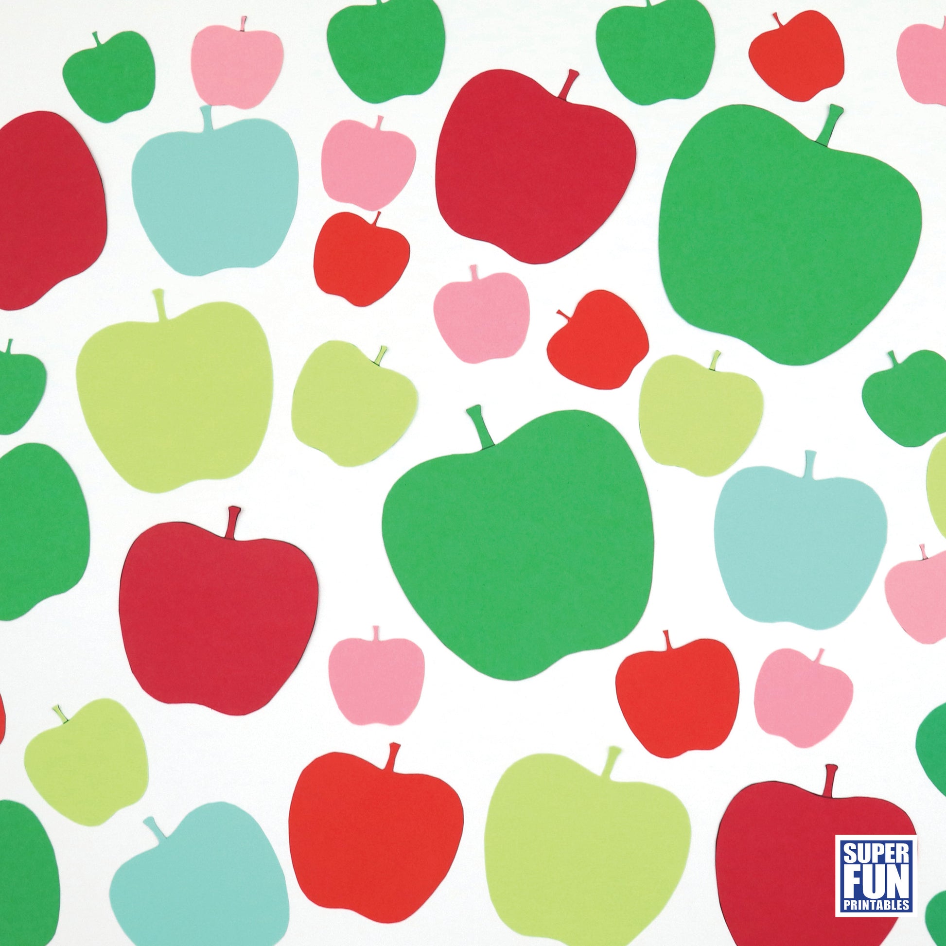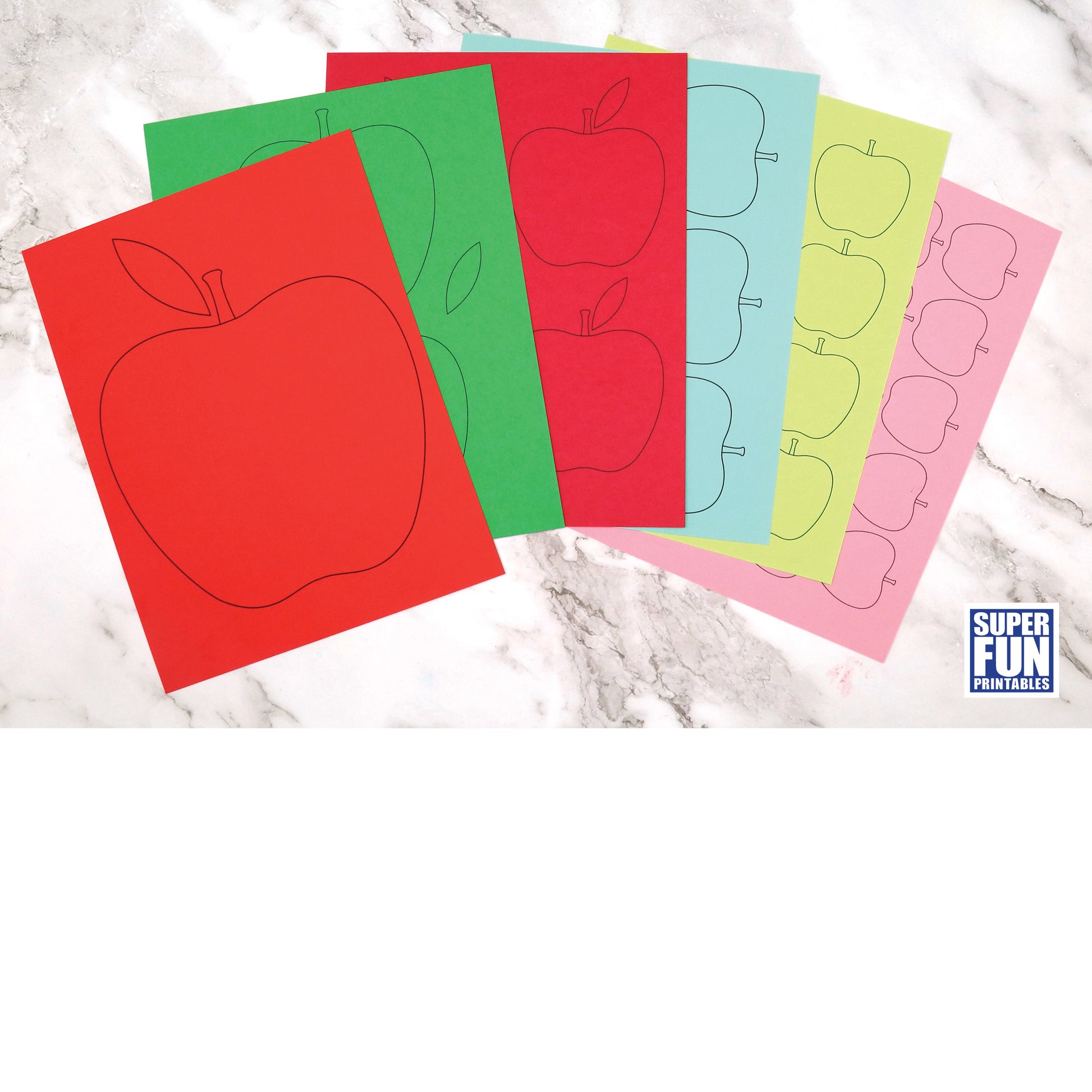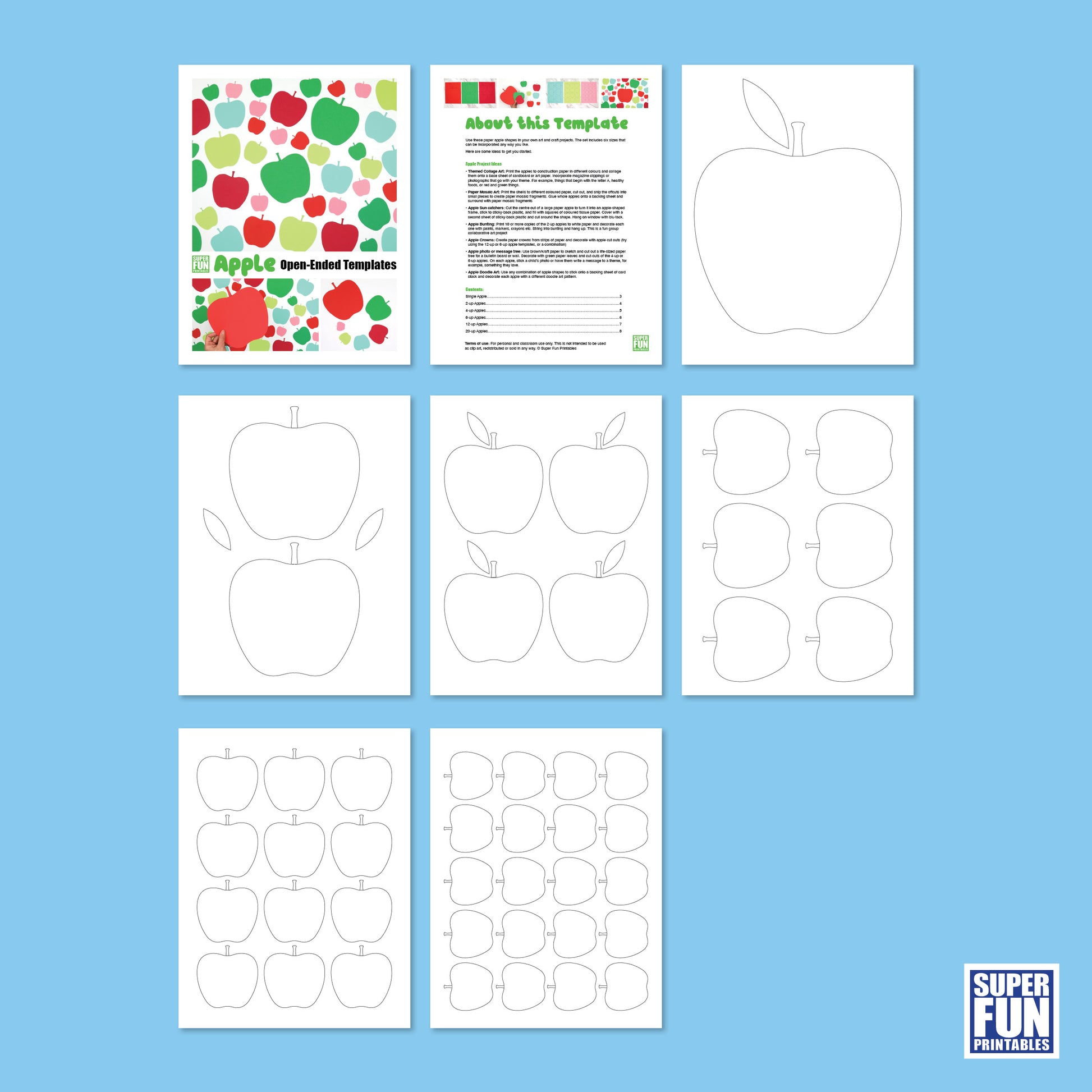 • Six pages of apple shapes in assorted sizes from full page to 20 per page.