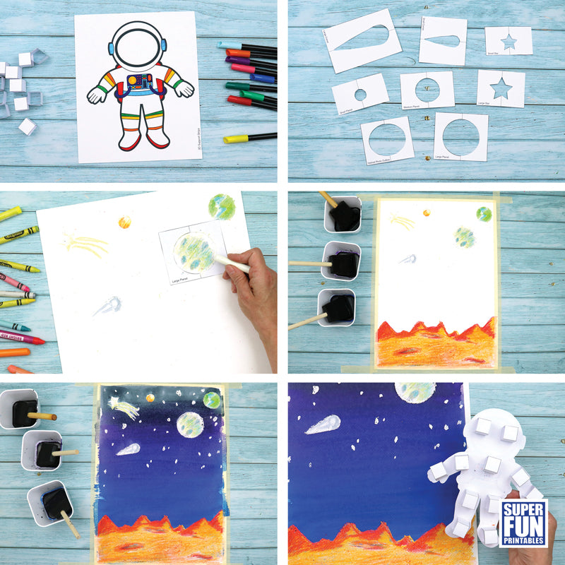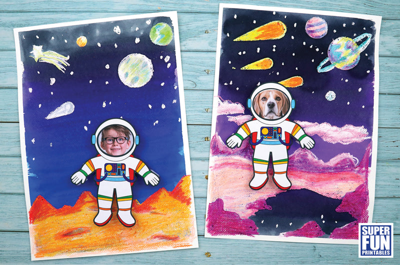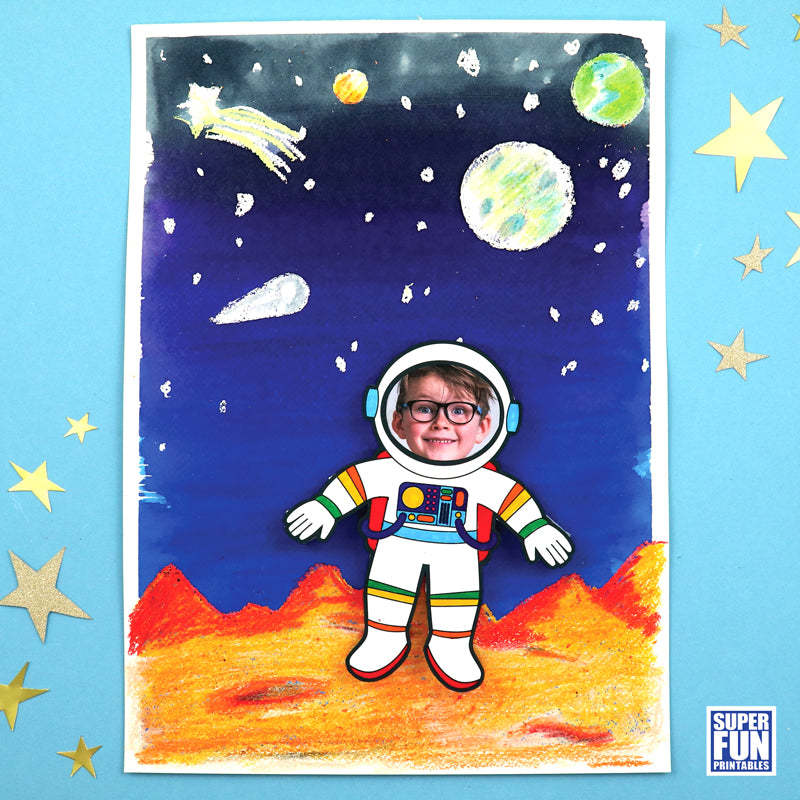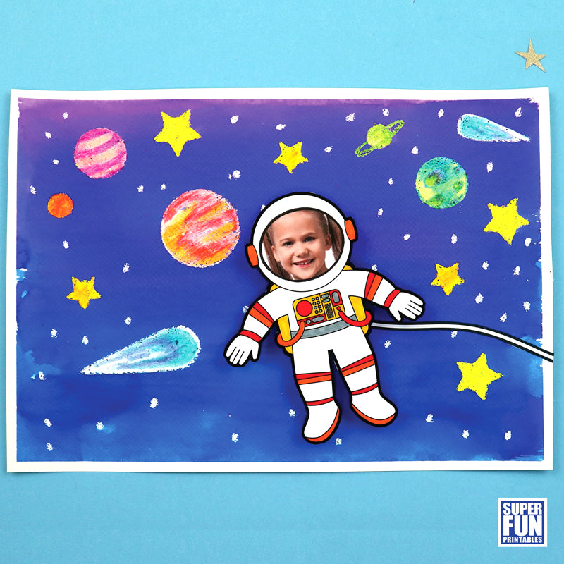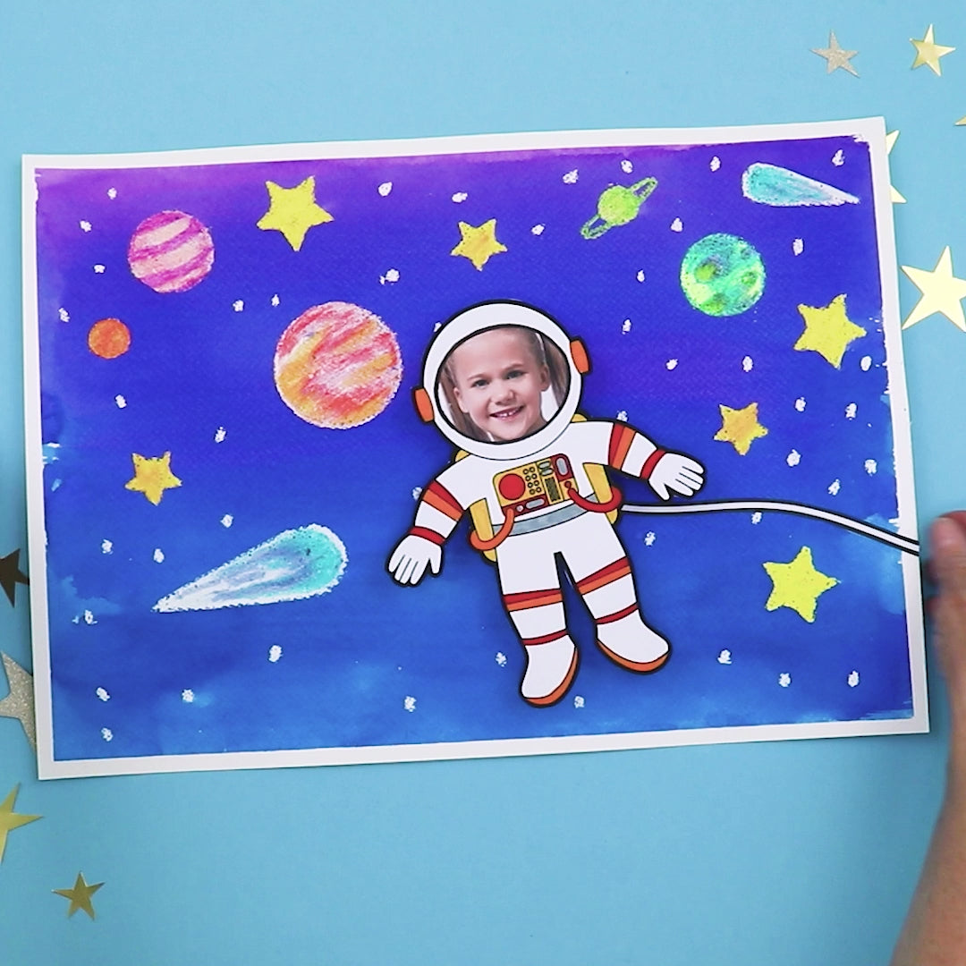 Create beautiful Space Art using a liquid watercolour and crayon resist technique featuring the artist as an astronaut!
