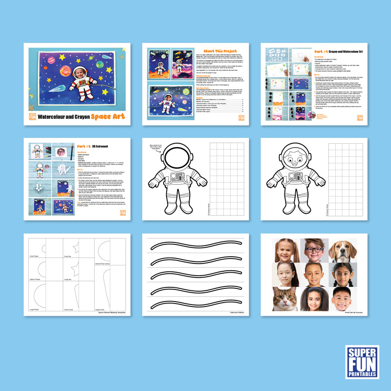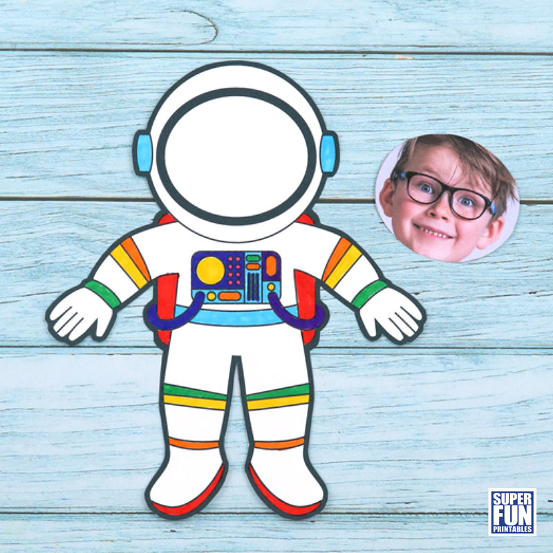The astronaut has a cool 3D effect created with our printable squares. If you don't want to use a photo in the astronaut's helmet, there is an astronaut with a cartoon face included in the template.