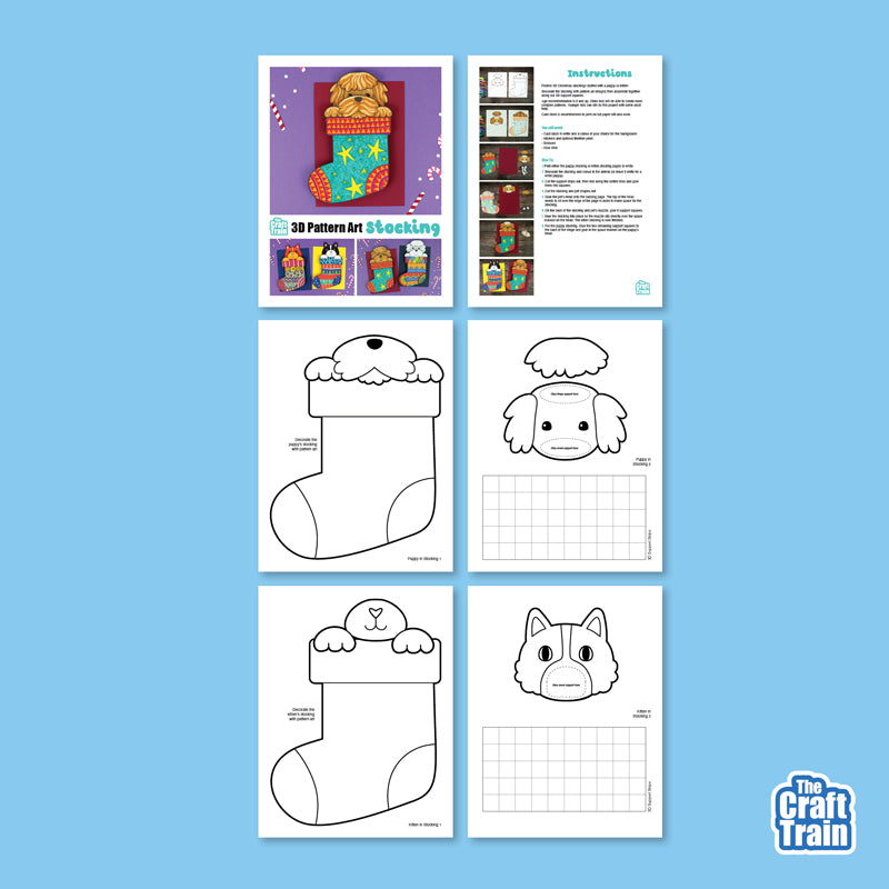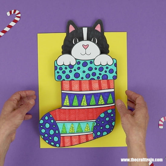 Make the cutest pattern art stocking with a kitten or puppy inside! This is a fun Christmas art project for kids to celebrate the festive season.