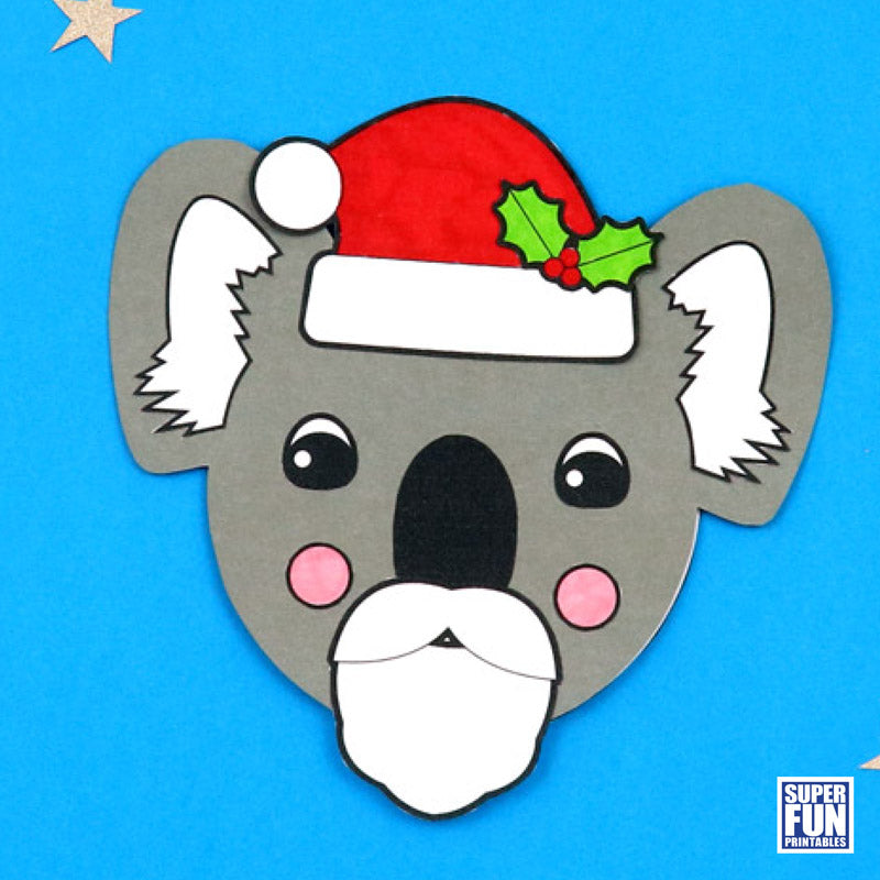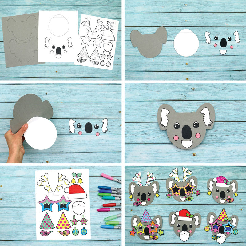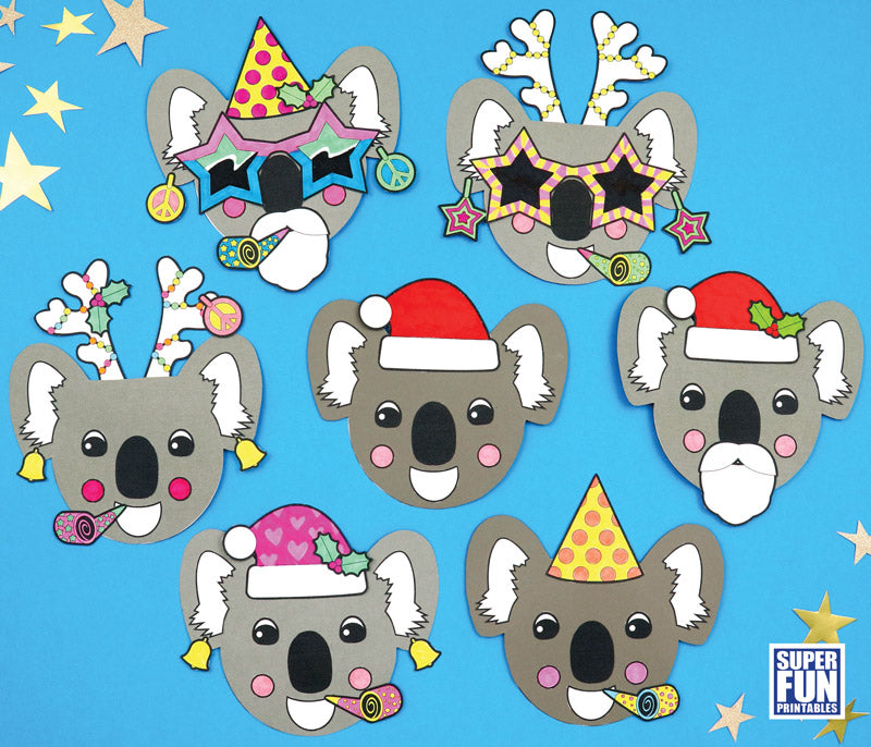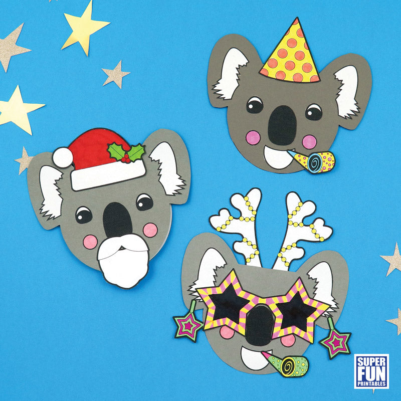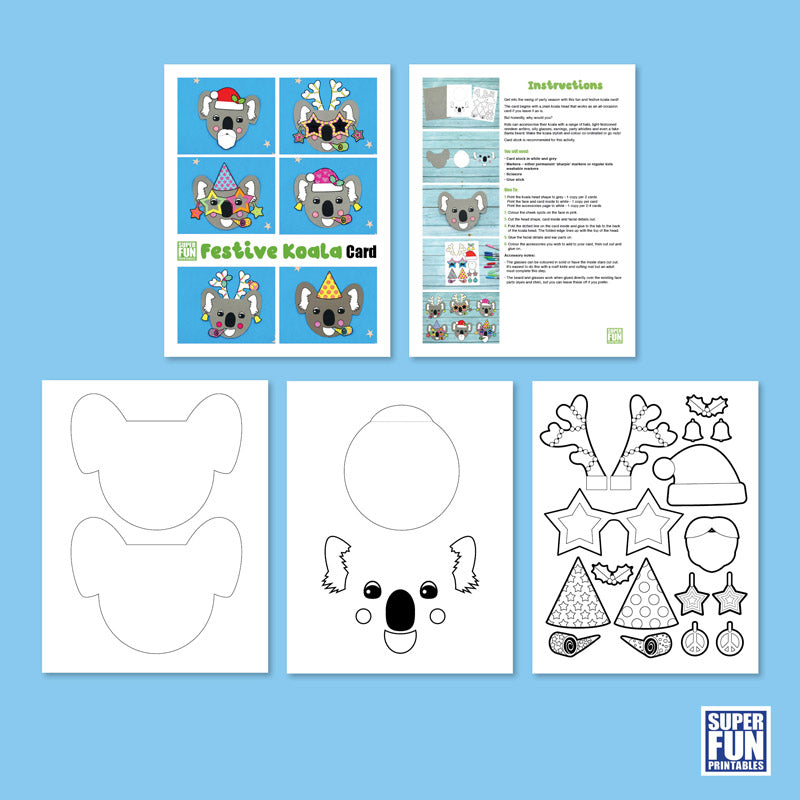 The card includes a base koala head that can be accessorised for Christmas and New Year with printable glue-on decorations. Give your koala a Santa hat, a fake beard, light-festooned antlers, silly glasses, a party hat and earrings.