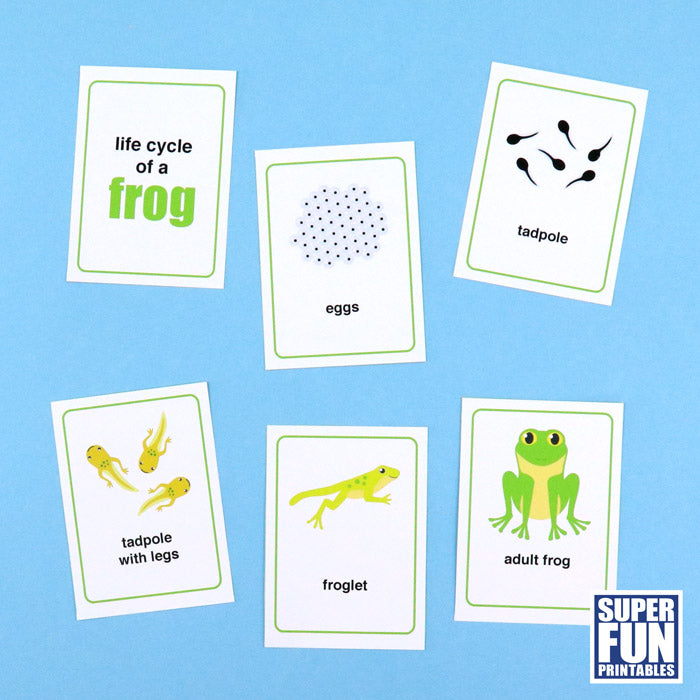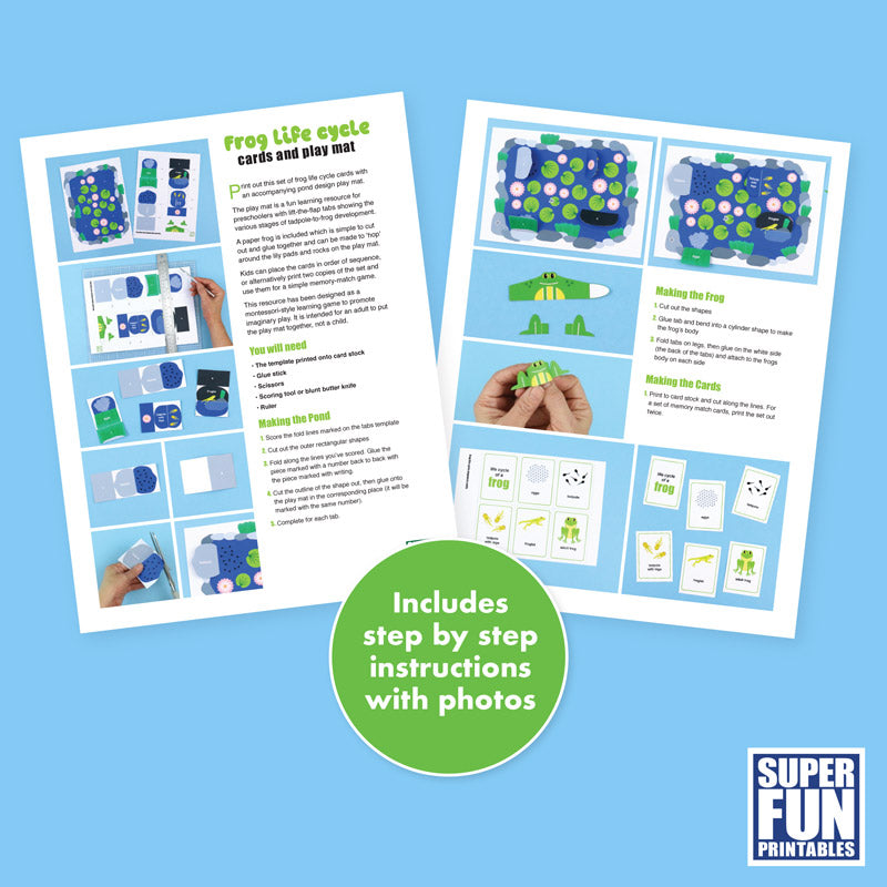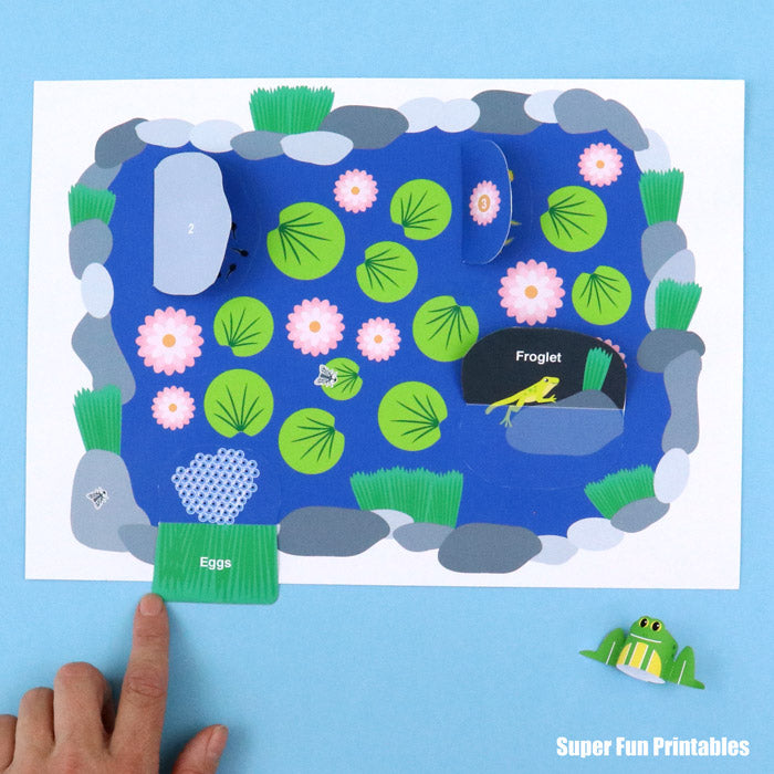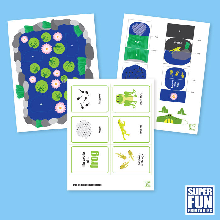 Print out this set of frog life cycle cards with an accompanying pond design play mat.