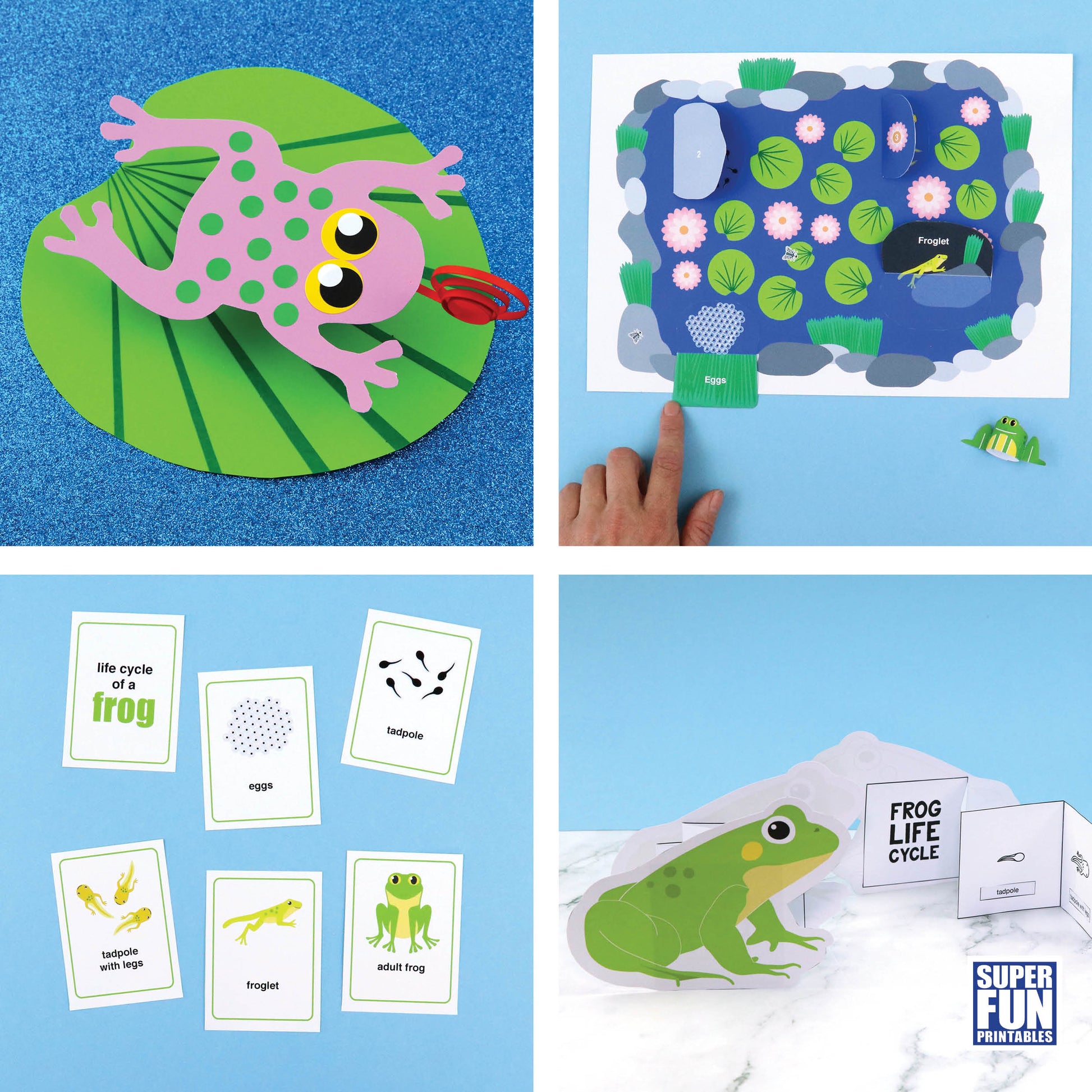 A selection of three Frog Printables, designed to help kids learn about the lifecycle of a frog in a fun and engaging way.
