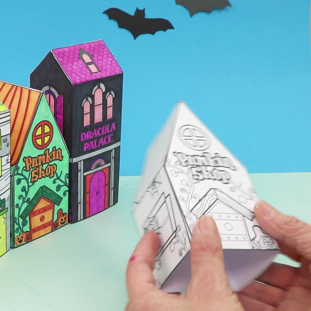 Welcome to Spook Town! A printable paper village with four cute Halloween-themed houses to print, colour and make.