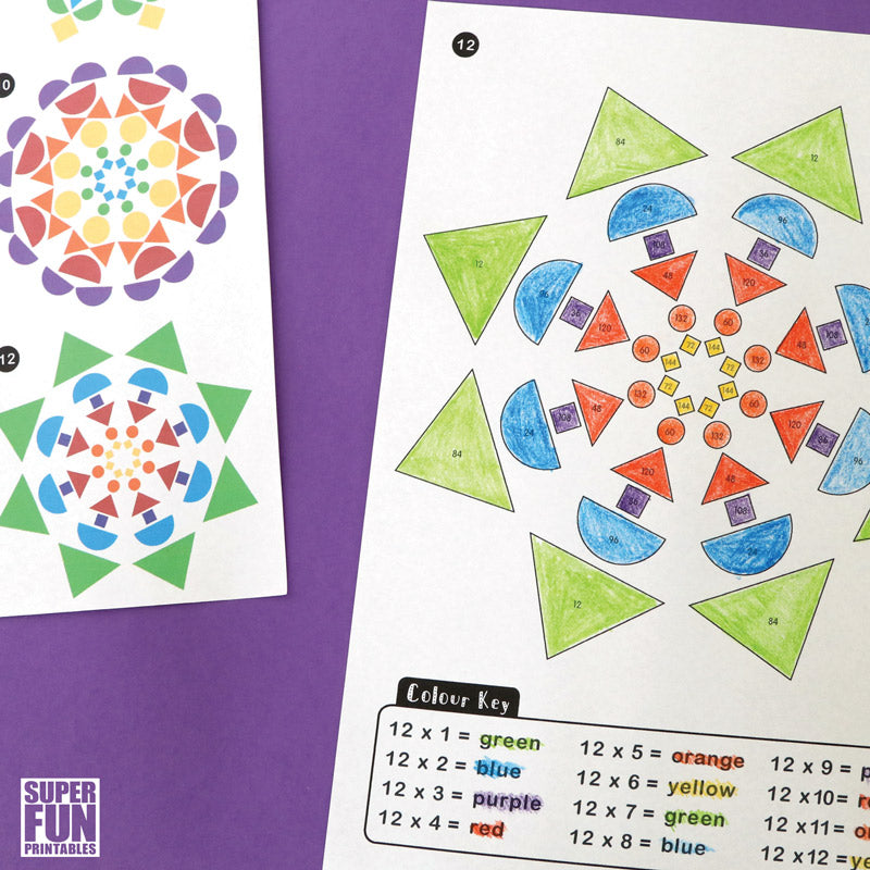 This printable set of colouring pages includes a geometric shape mandala for all the times tables from 1-12, as well as a set of full-colour mini mandalas for reference.