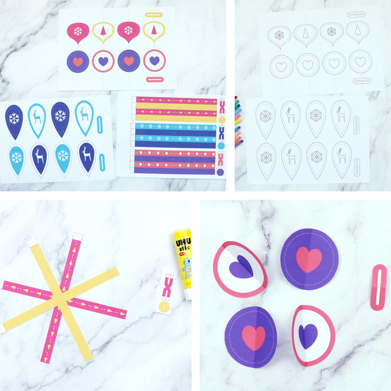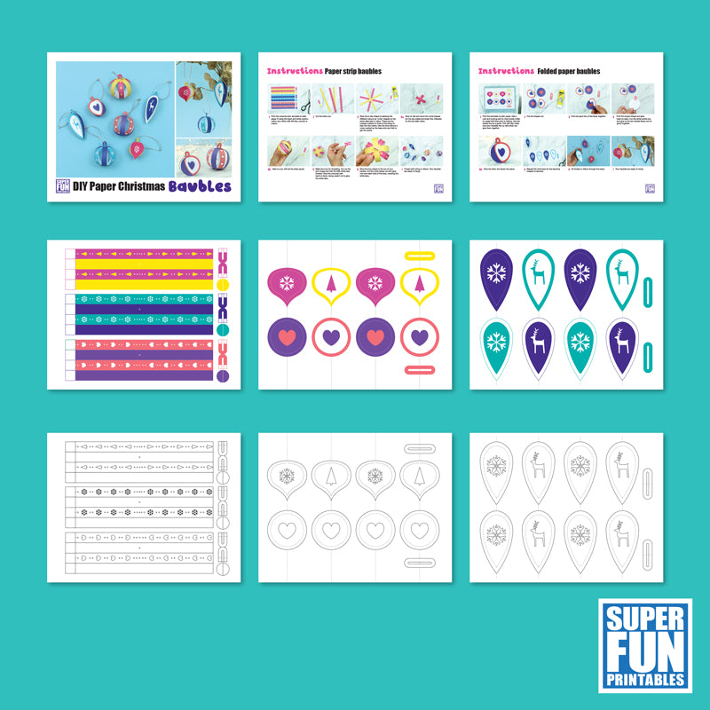 - The paper strip and and folded paper bauble templates in both full colour and colour-your-own