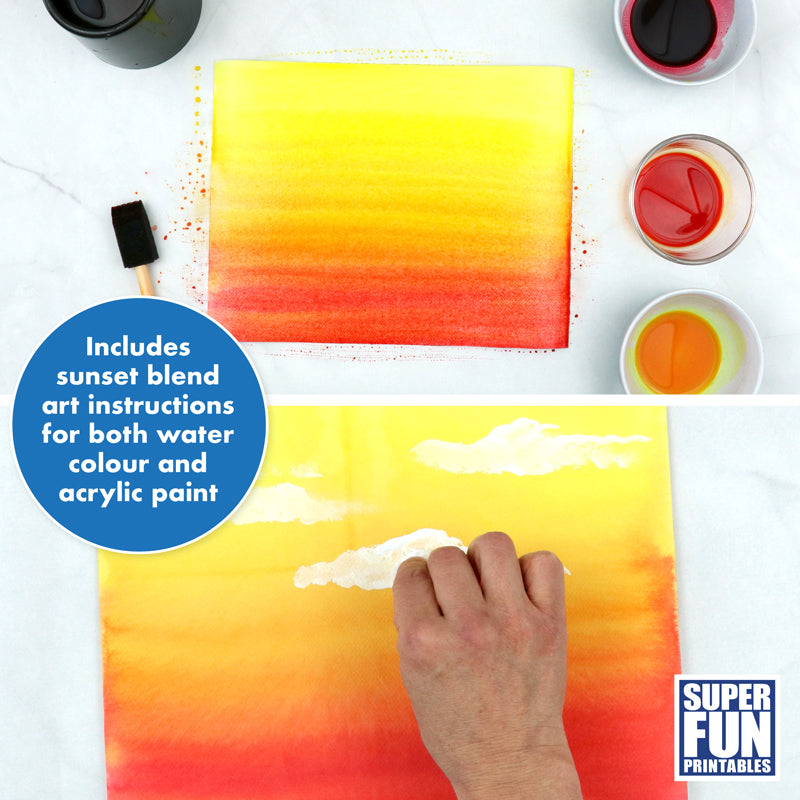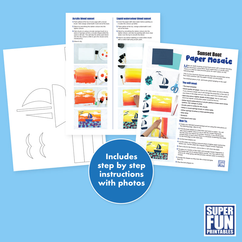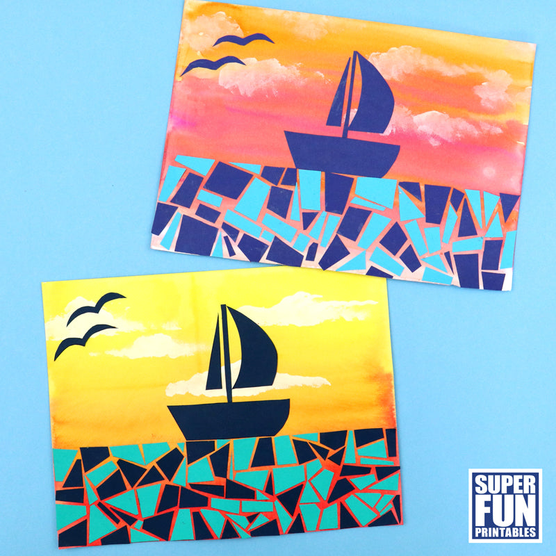 Make a sunset boat mosaic artwork using this shape template plus a simple blending art technique. Instructions to create the process art background are included for both liquid watercolour or acrylic paint.