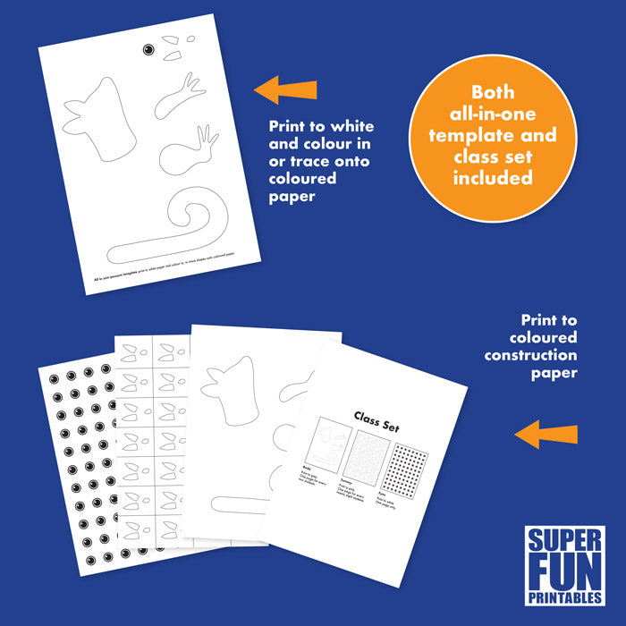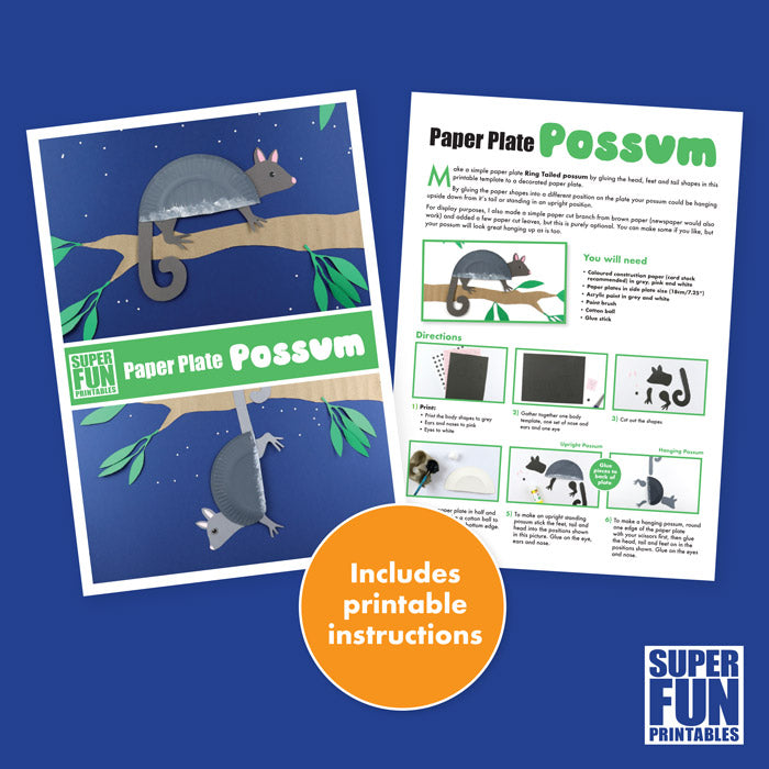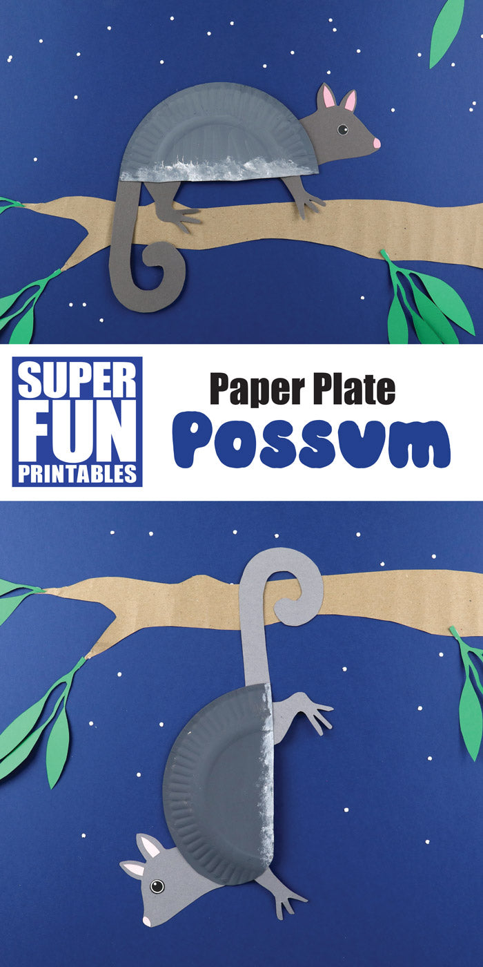 To make a possum all you need to do is cut a paper plate in half, paint it and then glue the possum shapes provided in this template to the back.