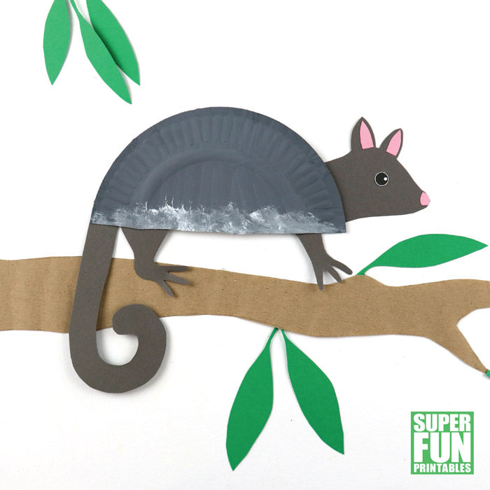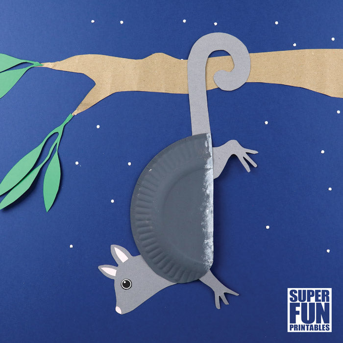 By gluing the shapes into a different position on the back of the plate you can make your possum hang upside down by it's tail or stand upright.