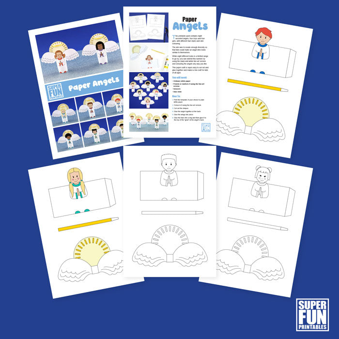 This printable pack contains eight assorted angels, four boys and four girls, each with different hair styles and skin colouring.