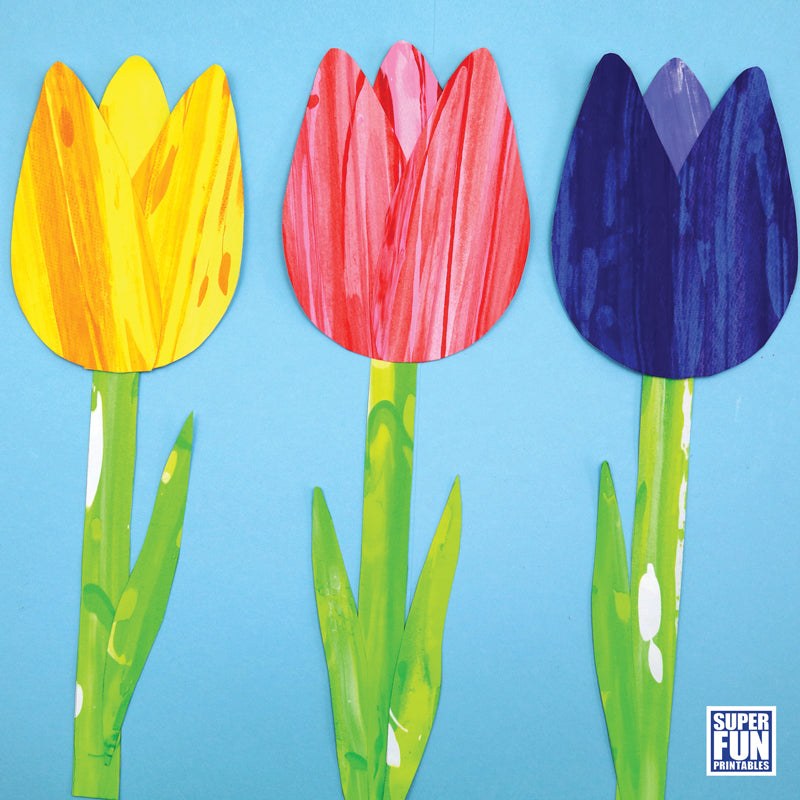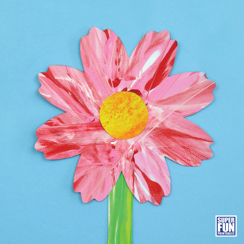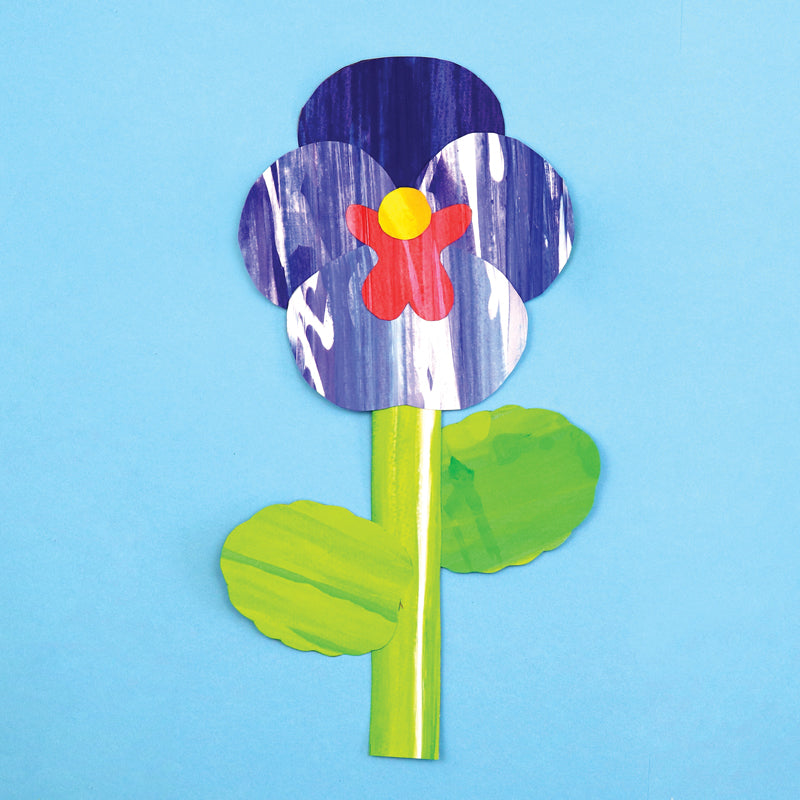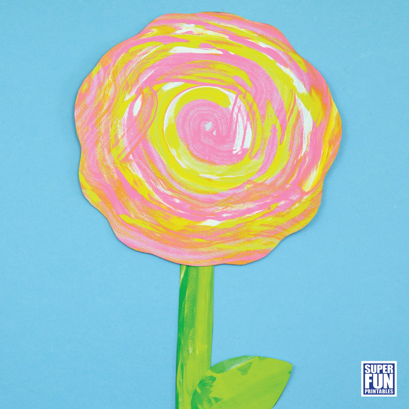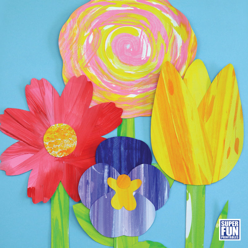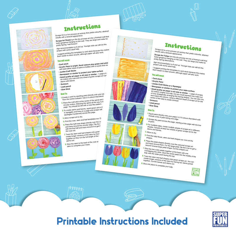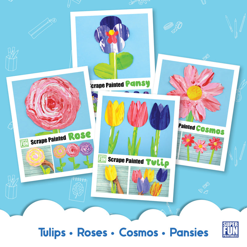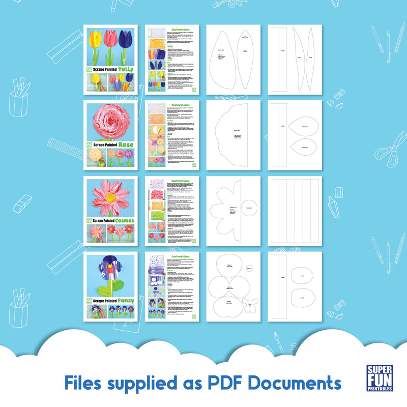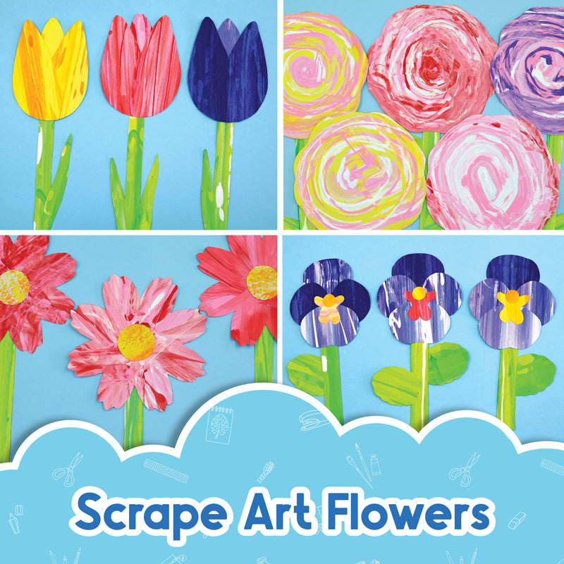 Each flower art project uses a specific scrape art technique to create a stylised arty flower with a textural appearance. There are printable flower petal, leaf and stem templates to create the finished bloom.