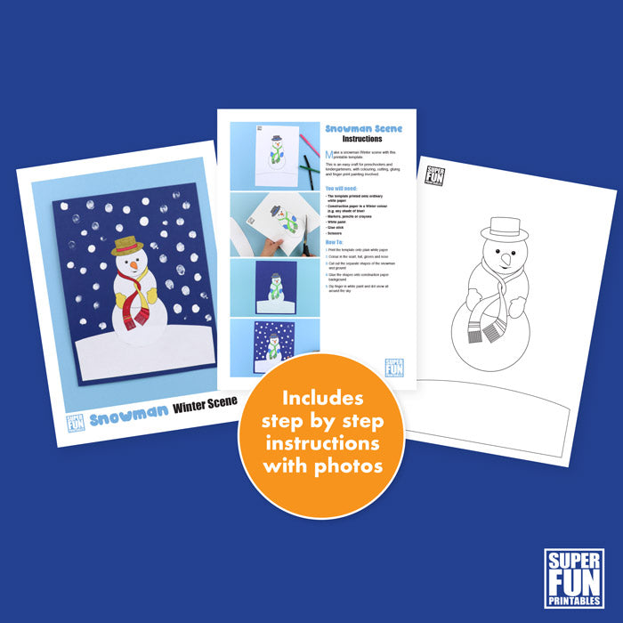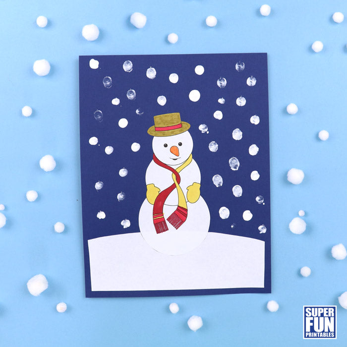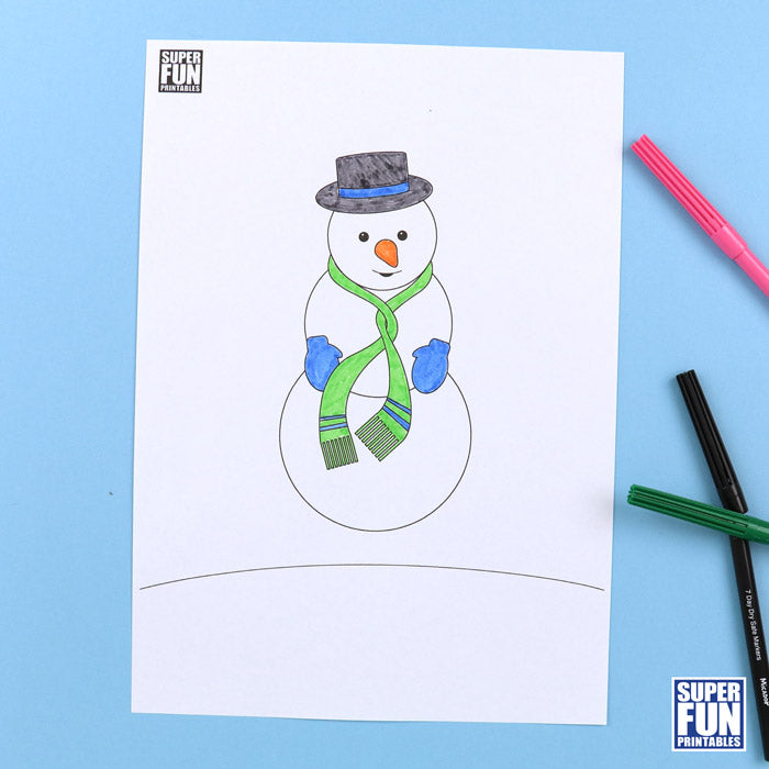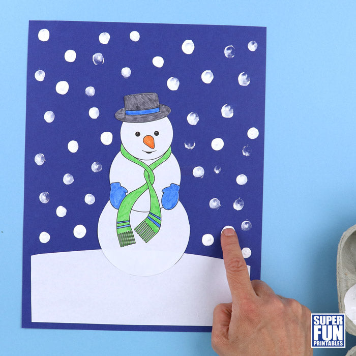 Kids will have fun colouring and cutting out the Winter snowman, then gluing it onto a paper background and adding their own fingerprint snow to the picture.