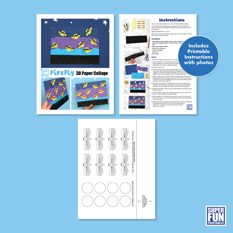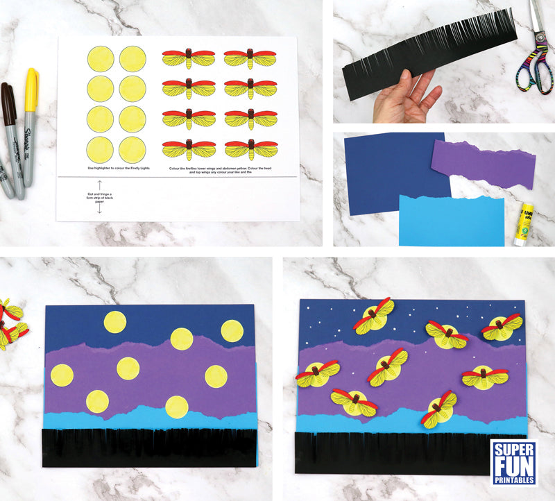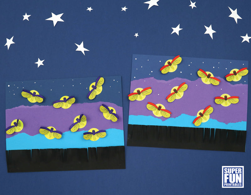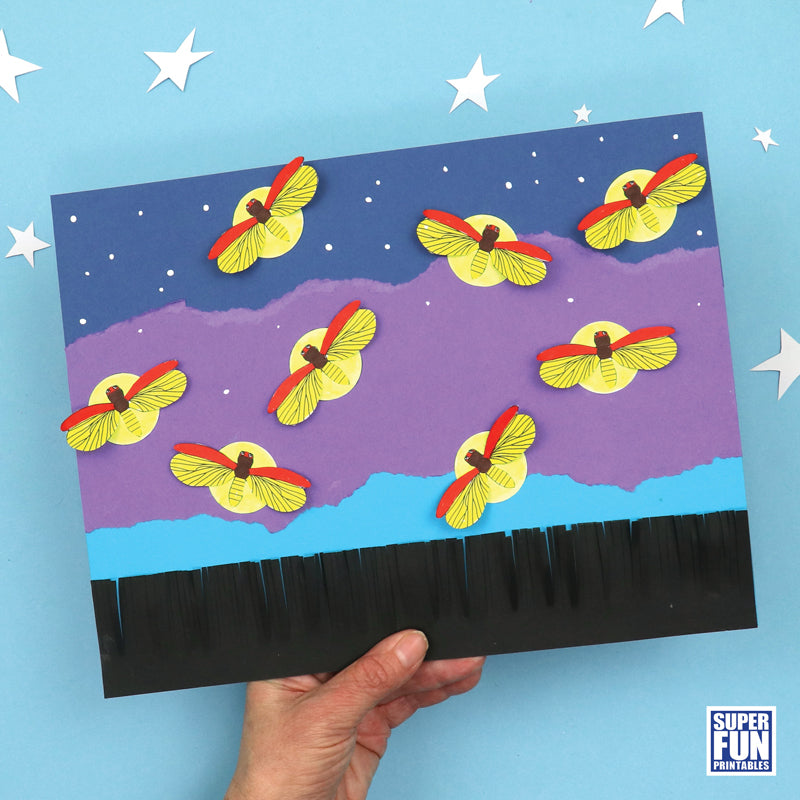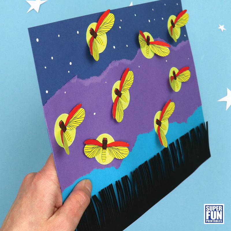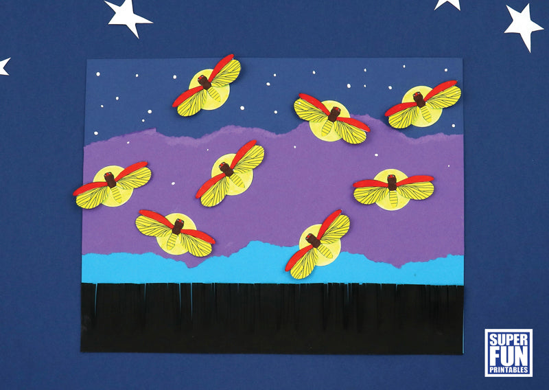 Create a twilight firefly scene torn paper collage with a 3D effect using this template. The fireflies' wings and the silhouette fringed grass 'pop' off the page.