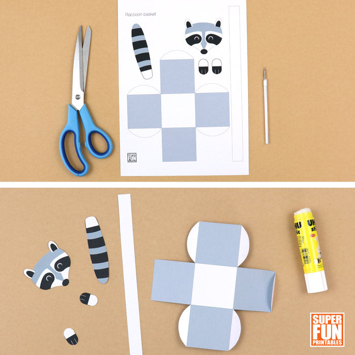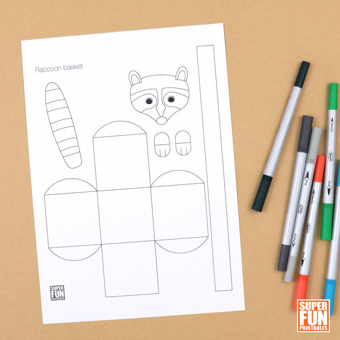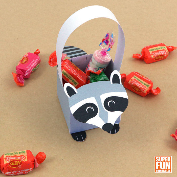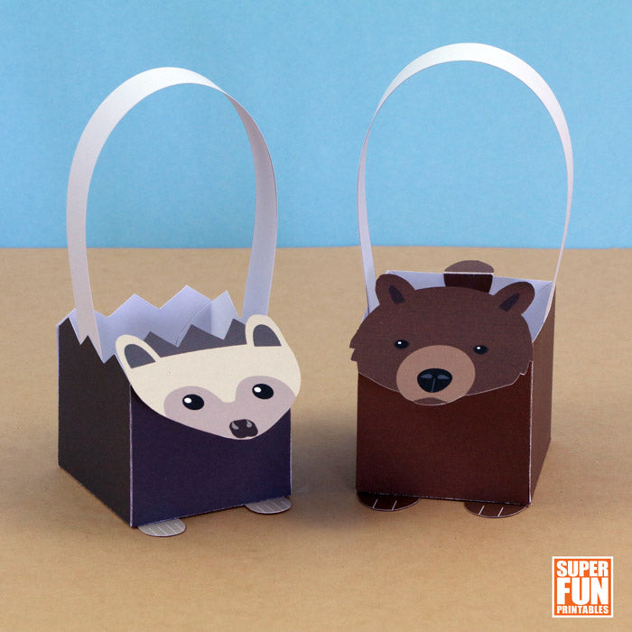 Print and create a set of four woodland animal baskets that are the perfect size to hold a hand full of small treats. The animal templates in the set include a brown bear, fox, raccoon and hedgehog.